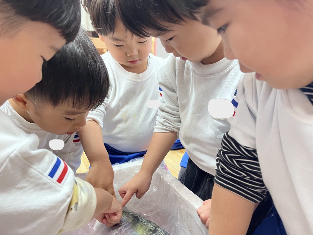 解体する前のぶりに触れ、匂いや色など感じたことを友達や保育者に伝えています。