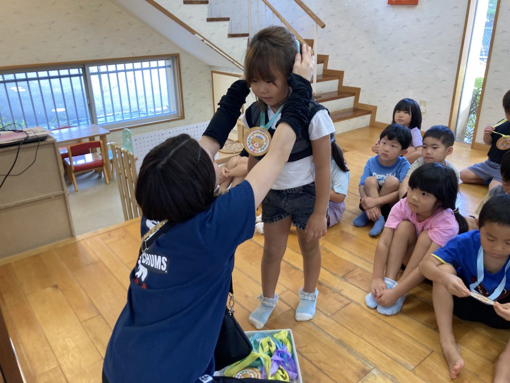 こども園に戻り、お泊まり保育を頑張った証の金メダルをもらう子どもたち♪