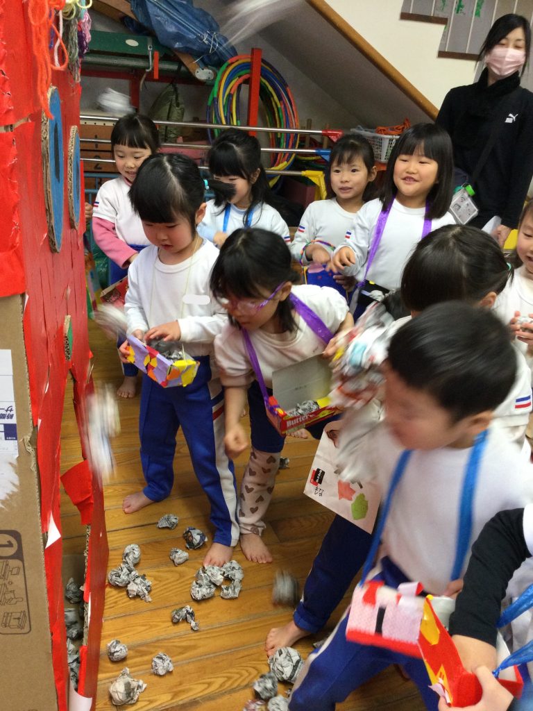 自分たちで作った手作り鬼に豆を投げて心に中の鬼をやっつけました。「おにはそと~ふくはうち~!」と言いながら友達と一緒に投げていました。