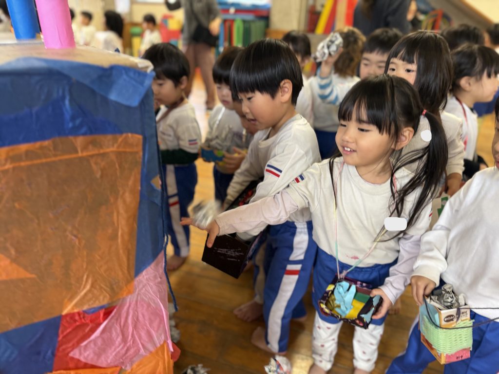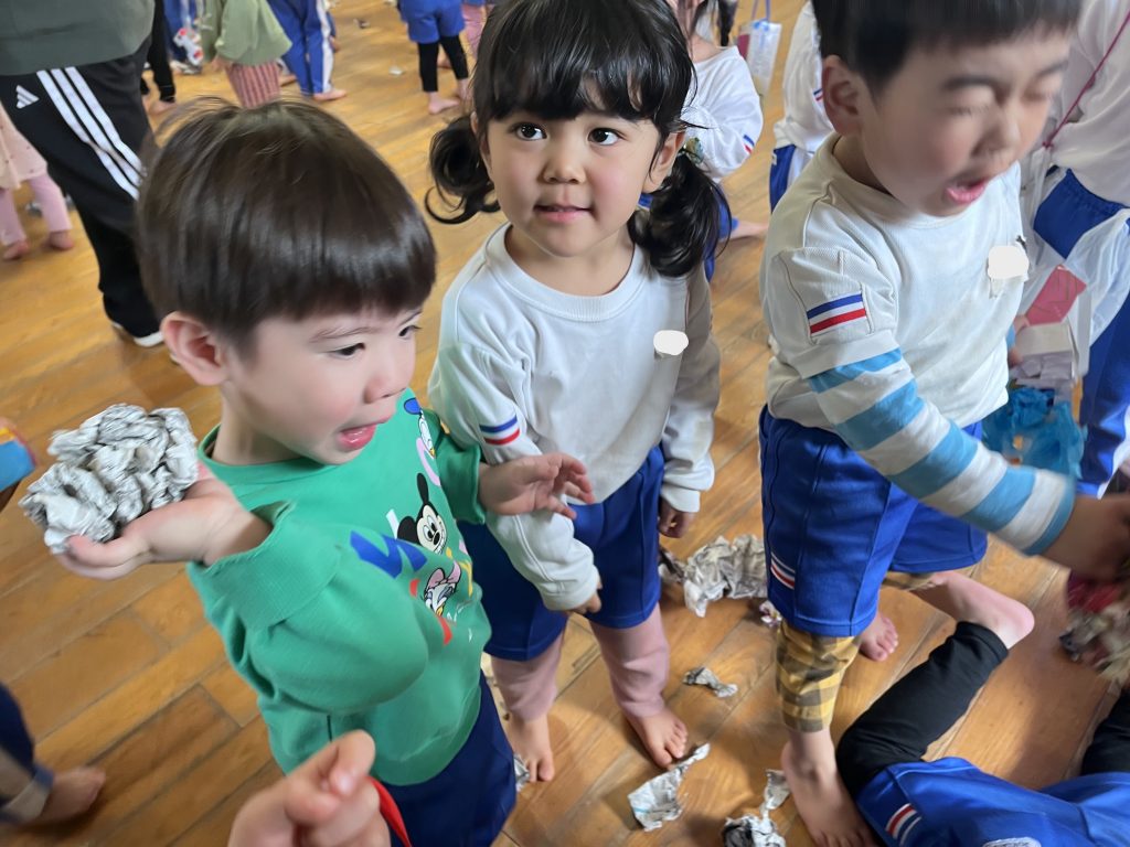 集いでは、心の鬼の話と保育士の寸劇を見ました。心の中の悪い鬼の登場に真剣に見ていました。