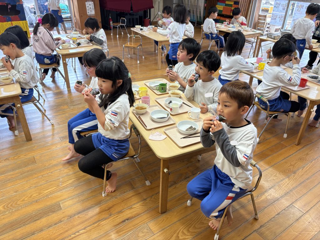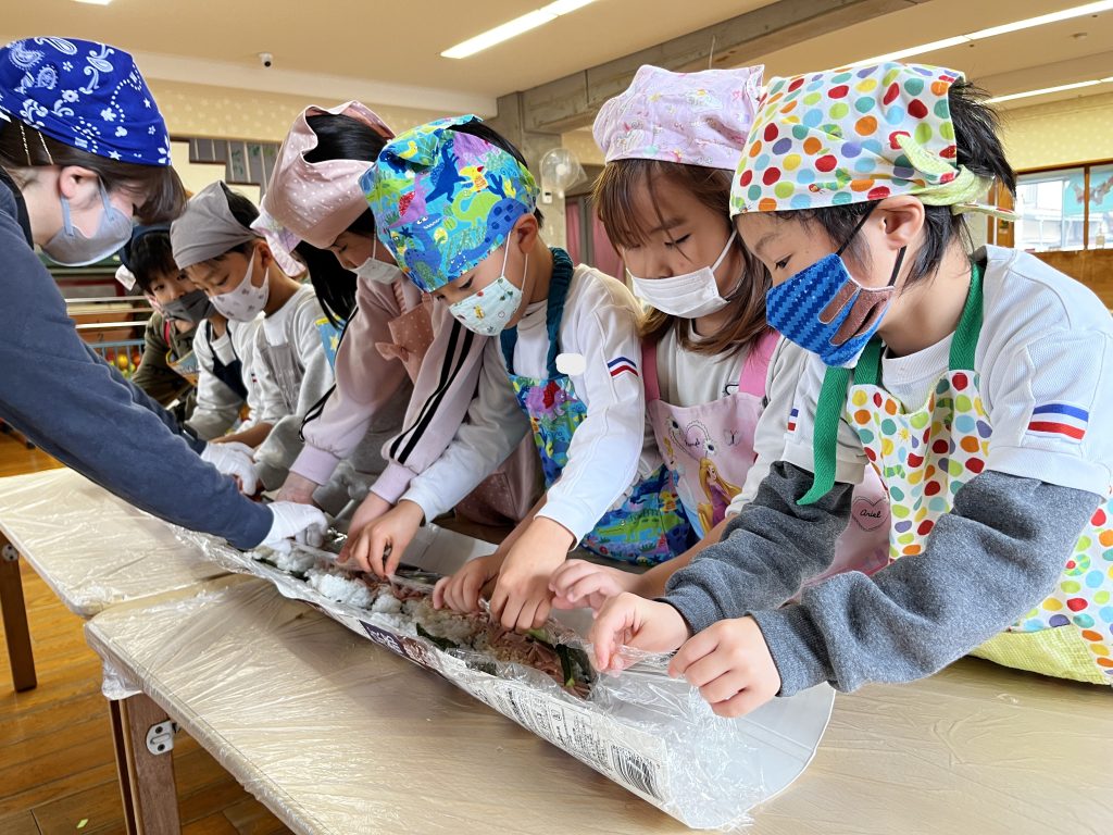 豆まきの次は、お楽しみの巻きずし作り。「むずかしい」「いくで」みんなで力を合わせてよいっしょ!!と巻いていきました。