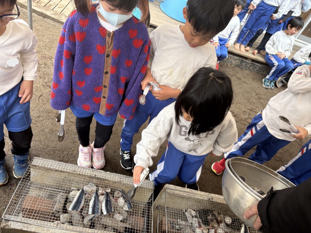 年長組のふじ組は、「あついな」と言いながらいわしを自分で焼いていったよ。