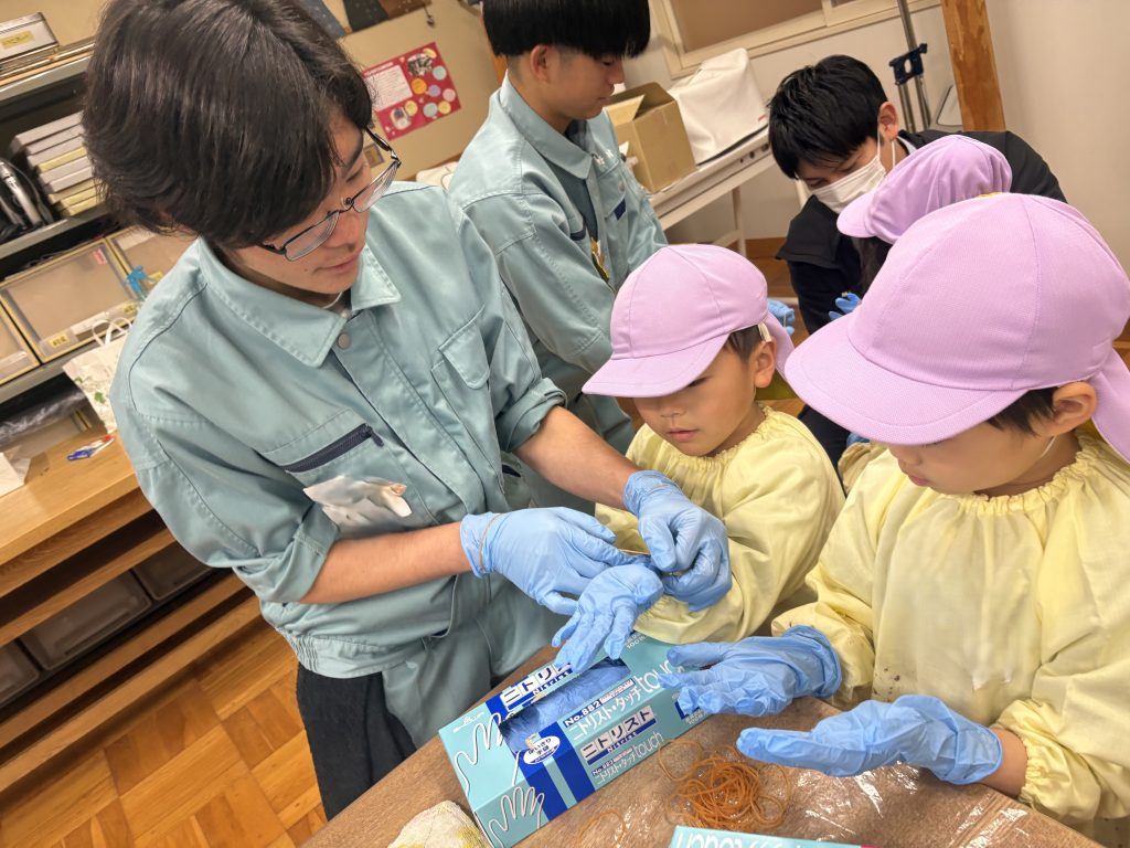 「手袋するよ~!輪ゴムでとめよか!」