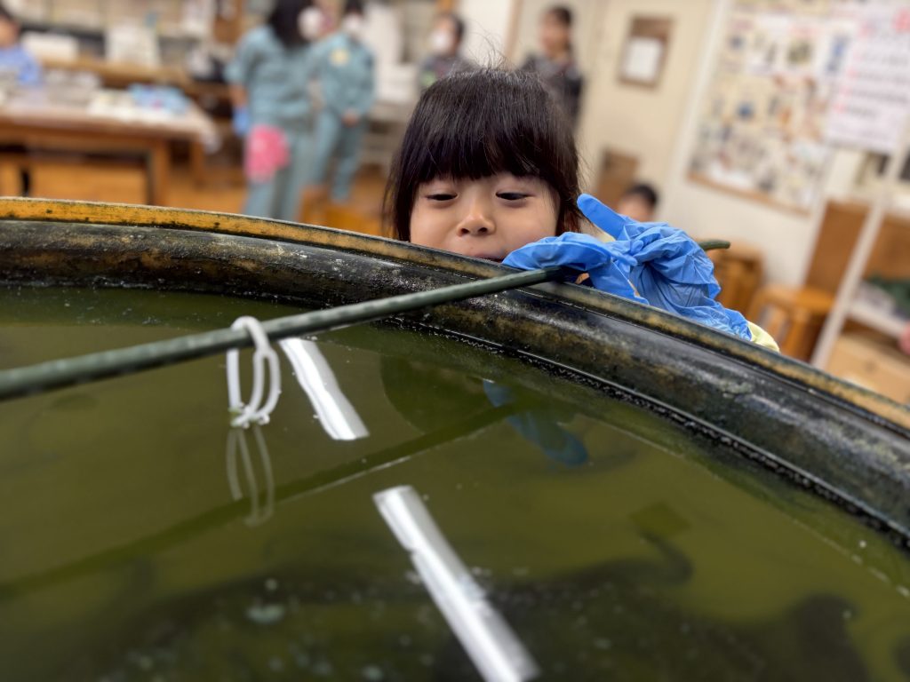 園の藍建てのバケツとはサイズが全く違う藍建ての入れ物に驚く子どもたち!