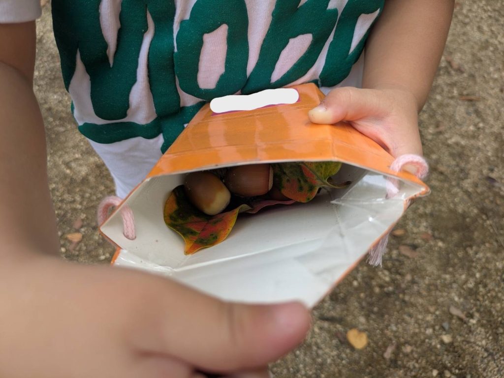 朝の歌や出欠確認をしたあとに、さっそく大好きな園庭に♪1人1つのかばんを持ち、見つけたどんぐりや小枝、落ち葉などを集めている姿がありました。