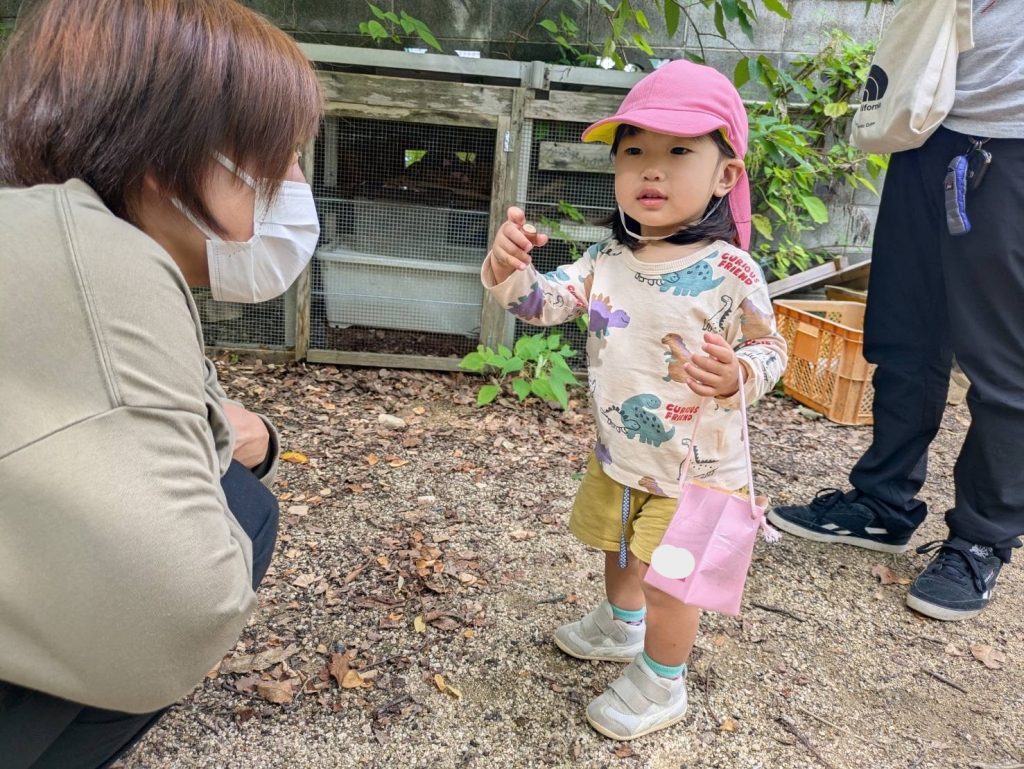 「せんせみて~!」と見つけた自然物を保育者に見せてくれます♪「誰と取ったん?」と聞くと、「まま~!」と、嬉しそうに教えてくれました★